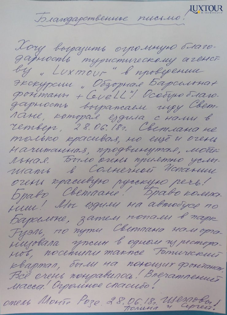 Хотела выразить благодарность компании LuxTour за прекрасную идею и ее великолепную реалищацию, связанную с экскурсией Канны-Монако-Монте Карло-Ницца. Все два дня (11-12 июля 2017 г.) , проведенные вместе с комадой Вашей компании, прошли на одном дыхании и с огромным приращением знаний. В этом путешествии мы были в надежных руках нашего Гида Светланы Андреевой и водителей высшего класса : Моисес и Антонио. Светлана сделала поездку интересной, запомнившейся не только красивыми пейзажами, архитектурой, но и познавательной. Экскурсанты находились рядом с ней и с огромным удовольствием слушали ее, насыщенный информацией рассказ, даже тогда, когда уже было предоставлено свободное время и индивидуальный просмотр достопримечательностей. Огромное спасибо и низкий поклон профессиналам!!
